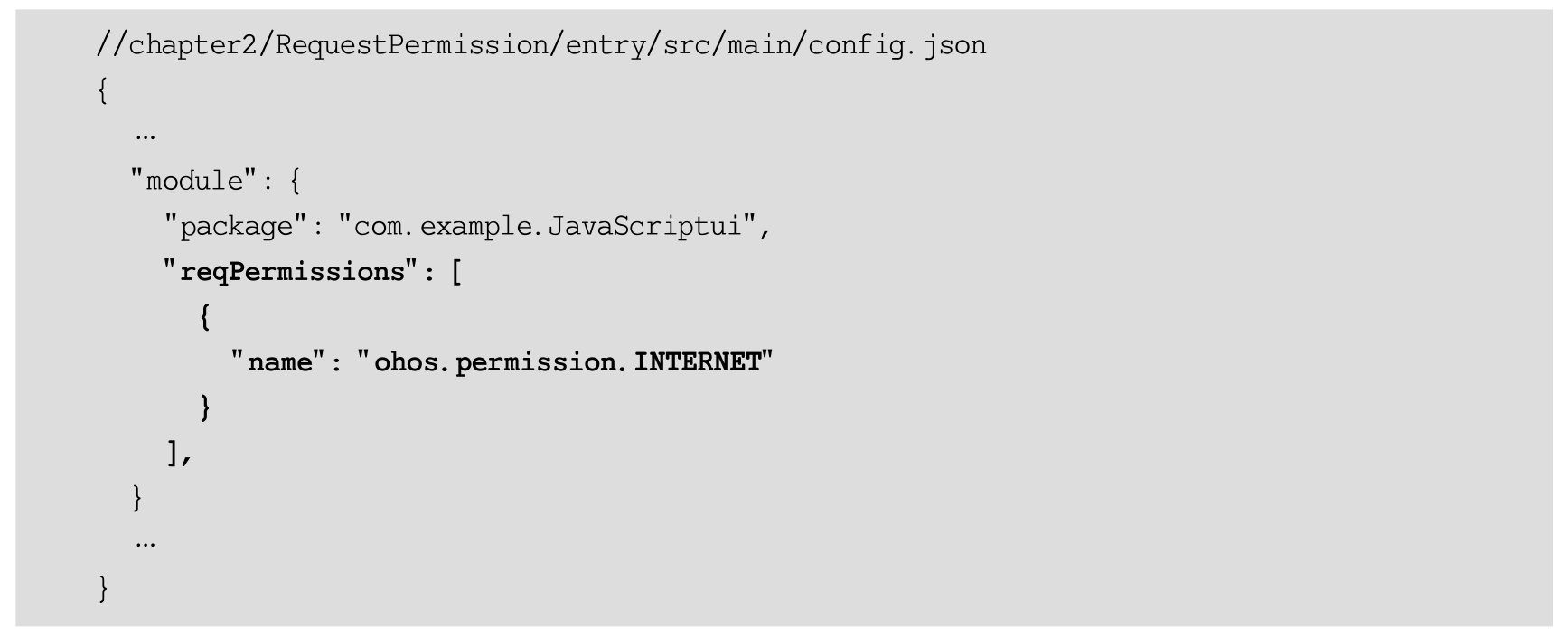 name属性是必填项,其他的属性是选填项。对于非敏感权限,通常只需使用name属性。例如,如果应用程序需要访问网络,则只需将name属性为网络访问权限名称字符串ohos.permission.INTERNET的权限对象添加到reqpermission数组中,代码如下: