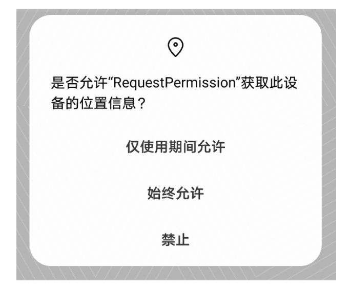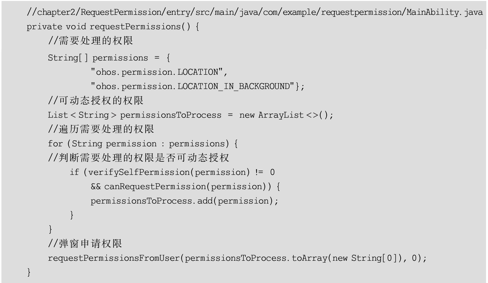 在上述代码中权限名称还可以使用SystemPermission类的常量字符串,例如ohos.permission.LOCATION字符串还可以被SystemPermission.LOCATION常量代替。初学者可先不用细究这段代码,直接应用在动态授权场景即可。