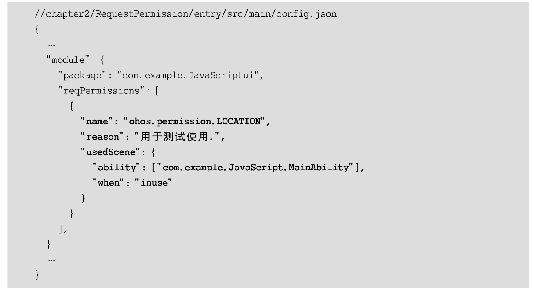 对于敏感权限,可以填写权限对象中的reason等属性,用作提示用户等。例如,如果应用程序需要访问设备的地理位置,则可以填写访问原因和相应的场景信息,代码如下: