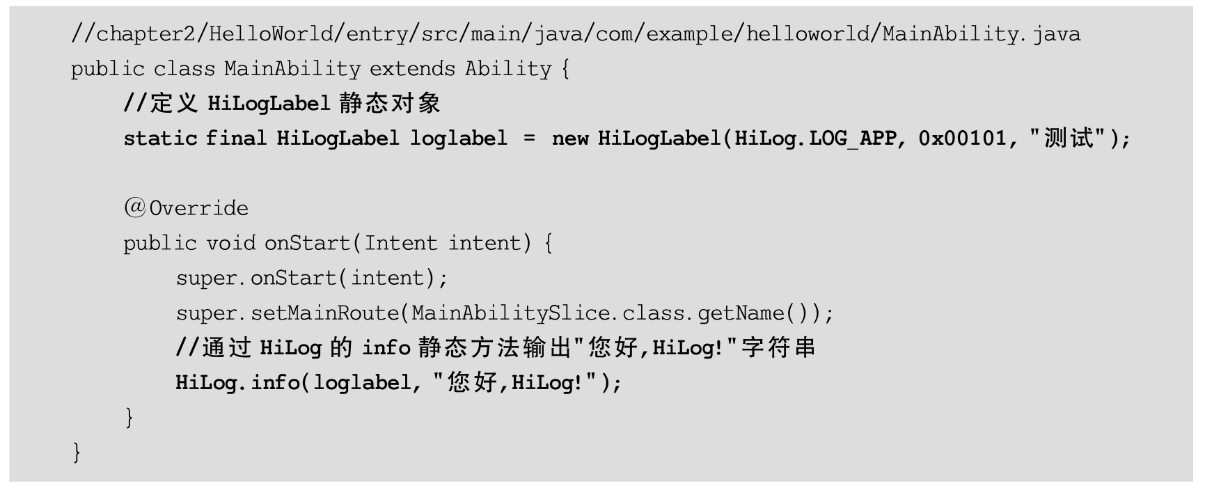 例如,在MainAbility.java文件中,通过一个HiLogLabel对象和HiLog的info方法即可在HiLog工具窗体中进行文本输出,代码如下(加粗字体为新增代码):