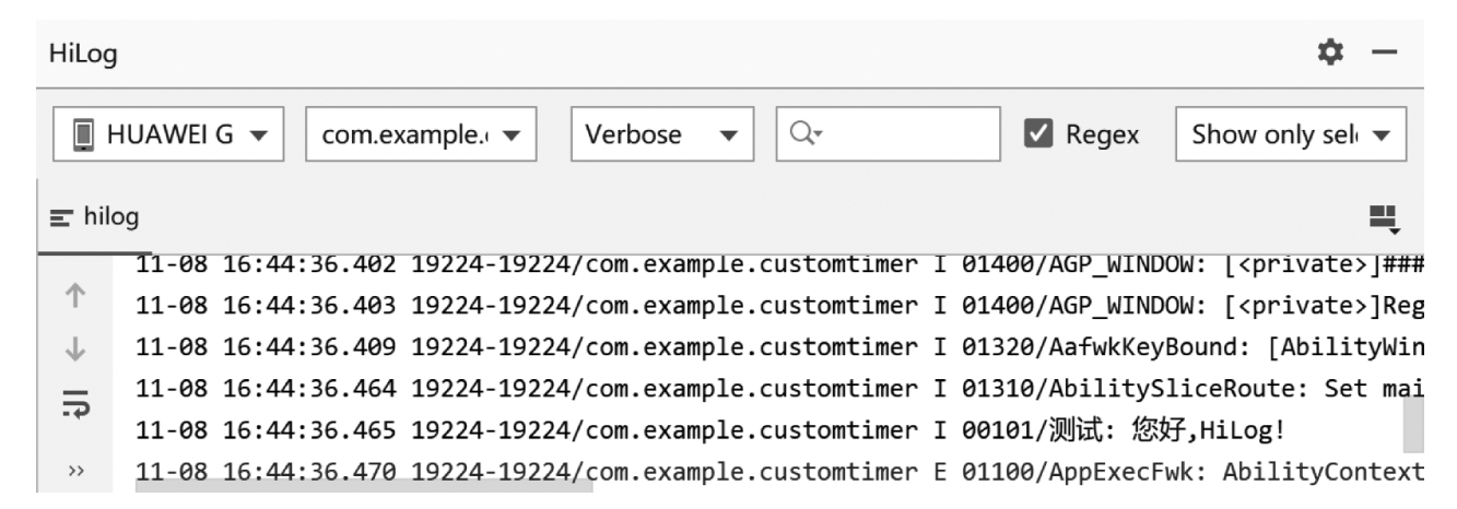 在这条输出文本中,com.example.customtimer代表了输出该文本的应用程序包名;I表示了HiLog级别为一般信息(Info);“00101/测试”代表了该HiLog所对应的服务域和标签名称。