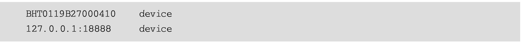 此时,会回显连接设备的设备名称的序列号(SN)。如果是远程虚拟机,则会显示127.0.0.1:18888。例如,当连接1个真机和1个远程虚拟机时会回显以下信息:
