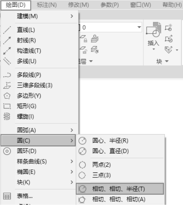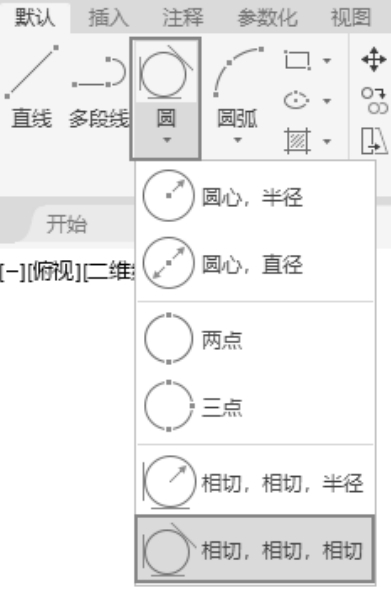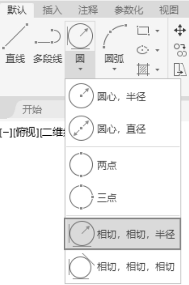 02 在“绘图”区域单击“圆”按钮下方的实心三角形按钮,在列表中选择“相切、相切、半径”命令,如图2-109所示。