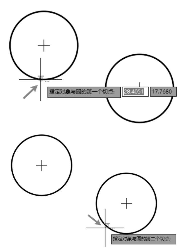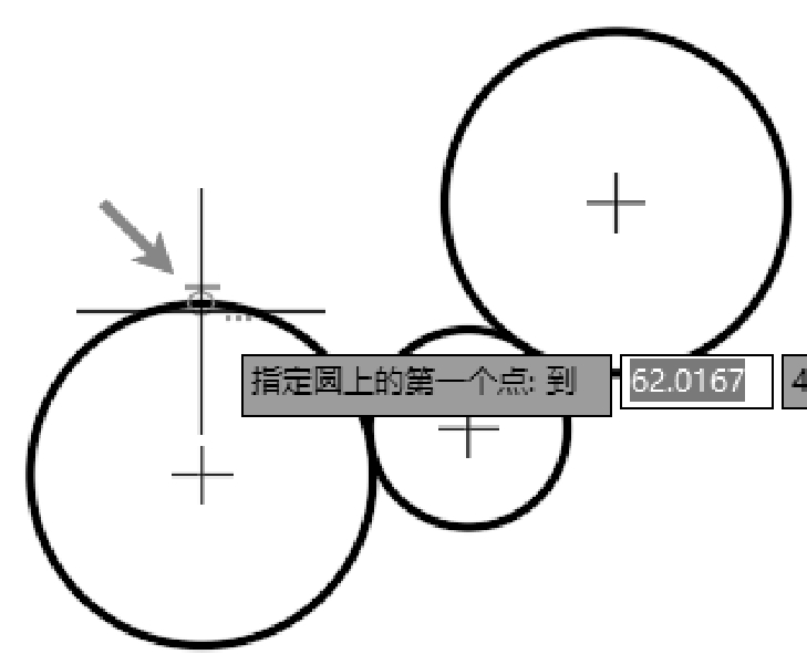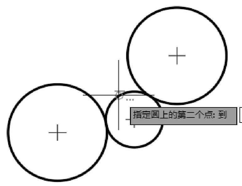 03 在左侧圆形上指定第一个切点,向右移动光标,在中间圆形上指定第二个切点,如图2-115和图2-116所示。
