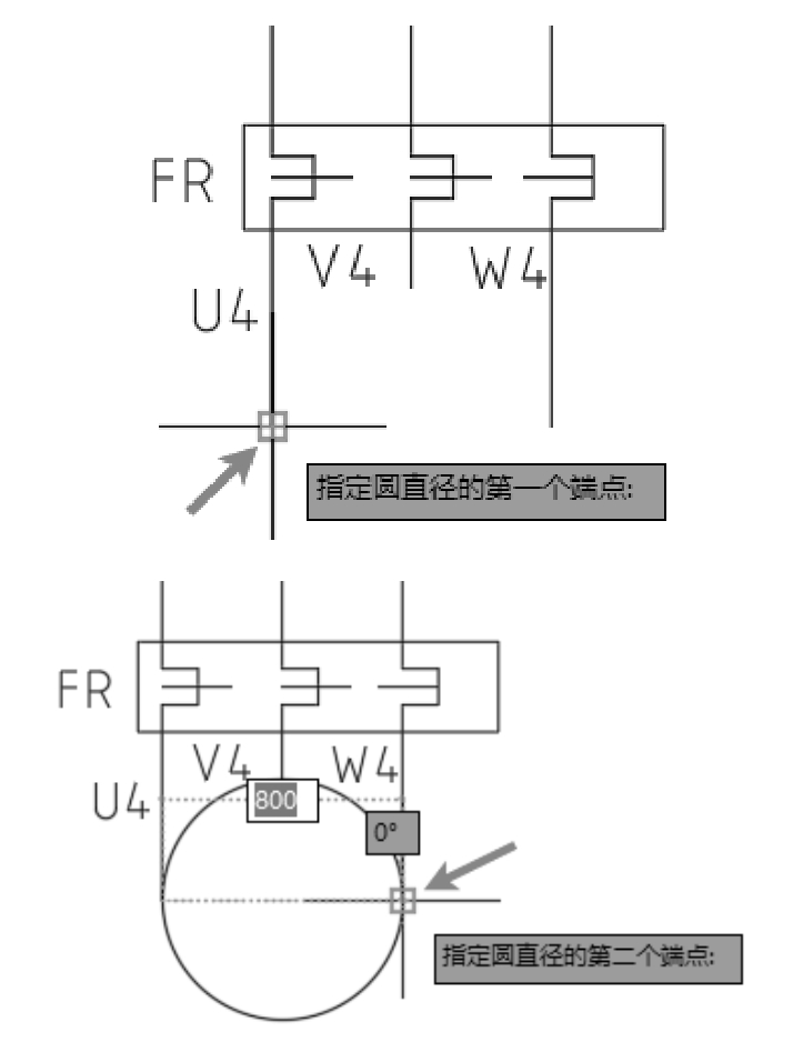 选择“两点”方式绘圆,需要分别指定圆形直径的两个端点。以两个端点为界创建圆形,是比较常用的绘制方式。本节介绍利用该种方式绘制电路图中的发动机图例的方法,具体操作步骤如下。