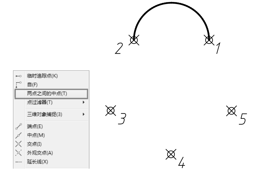 本例为一个经典考题,梅花图形由5段首尾相接的圆弧组成,每段圆弧的包含角都为180°,且给出了各圆弧的起点和端点,但圆弧的圆心却是未知的。绘制此例的关键便是要学会利用指定起点和端点来绘制圆弧,同时使用“两点之间的中点”这个临时捕捉命令来确定圆心,只有掌握了这两种方法才能绘制得既快且准,否则极为麻烦。指定端点绘制圆弧的具体操作步骤如下。