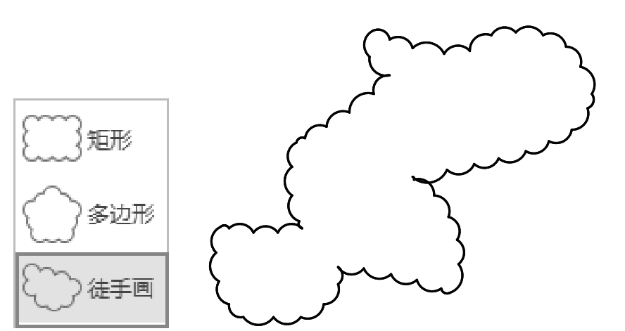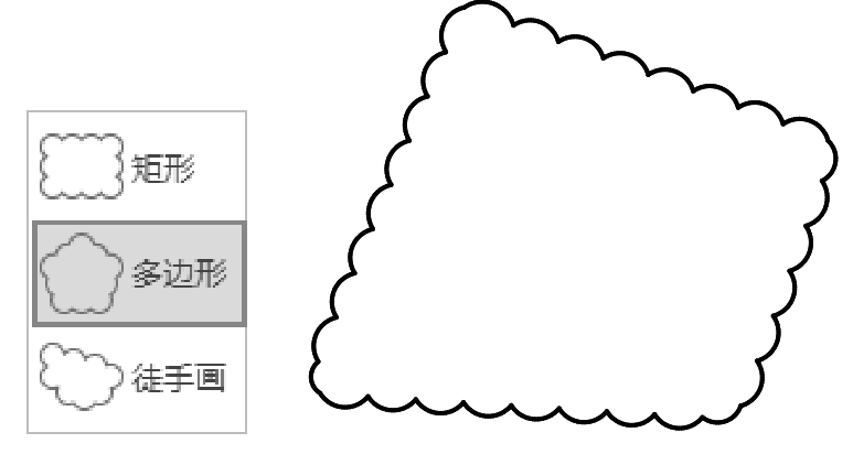 在“修订云线”列表中,一共提供了3种云线类型方便用户选择,分别是“矩形”“多边形”“徒手画”。选择“矩形”选项,可以创建规则形状的云线;选择“多边形”选项,可以自定义点创建不规则云线,如图2-180所示;选择“徒手画”选项,可以创建灵活多变的云线,如图2-181所示。
