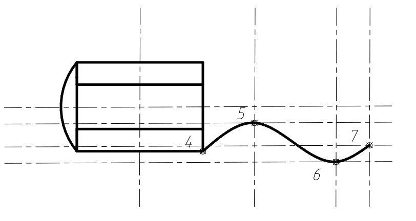 06 在命令行输入SPL执行“样条曲线”命令,连接点4、点5、点6和点7,构成曲线,如图2-159所示。