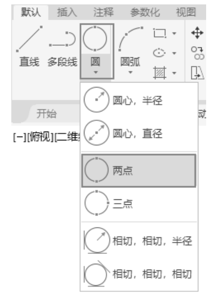 02 在“绘图”区域单击“圆”按钮下方的实心三角形按钮,在列表中选择“两点”命令,如图2-96所示。