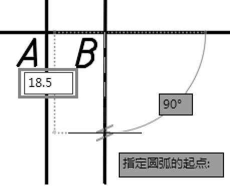 02 绘制圆弧。在命令行输入A执行“圆弧”命令,紧接着输入C启用“圆心”子选项,然后选择B点为圆心,再沿着垂直中心线向下拖动光标,待延伸线与垂直中心线重合时输入半径值18.5,如图2-127所示。