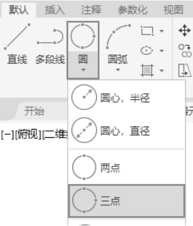 04 在“绘图”区域单击“圆”按钮下方的实心三角形按钮,在列表中选择“三点”命令,如图2-103所示。