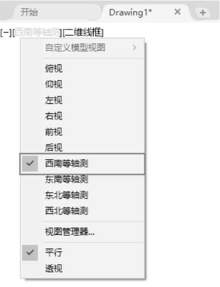 01 在绘图区域的左上角单击视图控件,在列表中选择“西南等轴测”选项,如图2-202所示。
