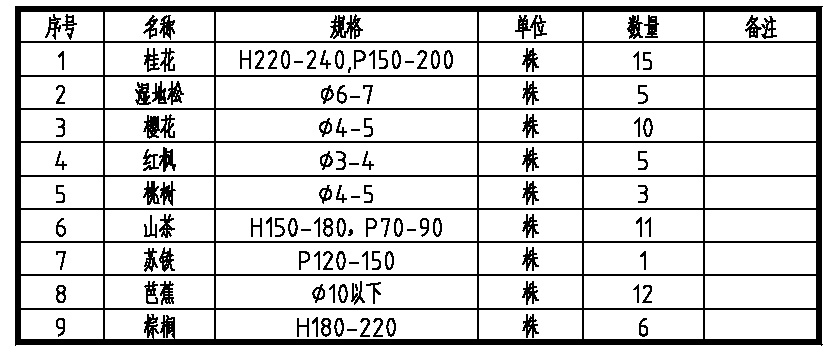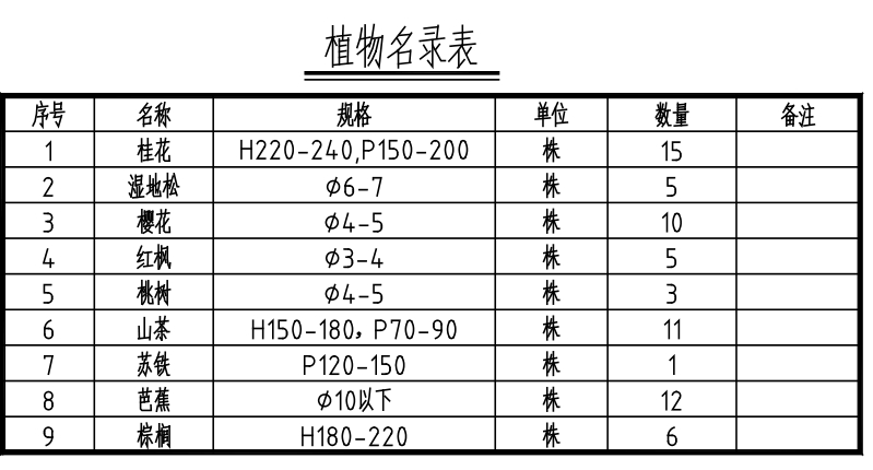 05 综合运用“多段线”命令和“多行文字”命令,绘制标题文字,植物名录表的绘制结果如图2-195所示。