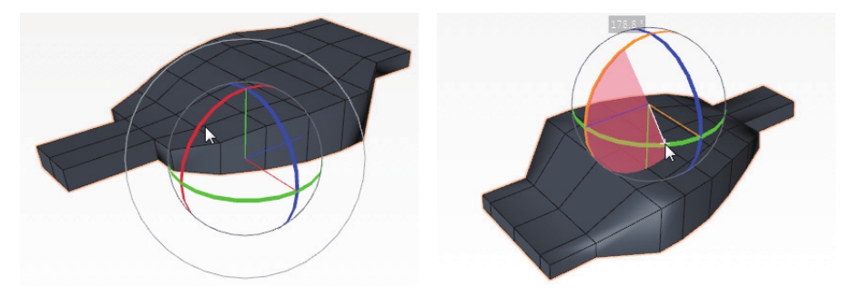 ,在视图中选择对象后显示旋转操控器,如图2-42所示。拖曳旋转操控器中的操控环可以旋转物体对象(并非是旋转视图)。