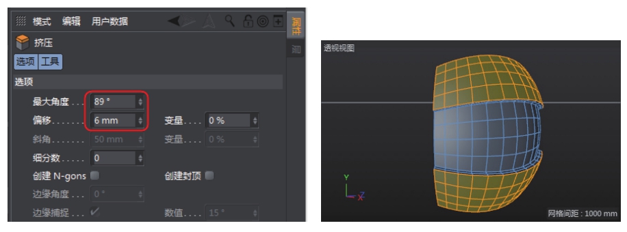 09 在“挤压”属性面板中设置“最大角度”值为89°,“偏移”值为6mm,按Enter键确认,其余选项保持默认,挤压效果如图3-171所示。