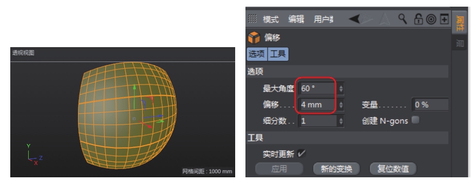 12 执行“选择”|“全选”命令,选取所有的球面,在视图中右击,并选择快捷菜单中的“偏移”命令,在属性面板中设置参数并按Enter键确认,如图3-174所示。