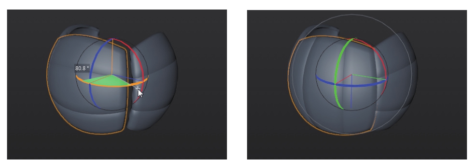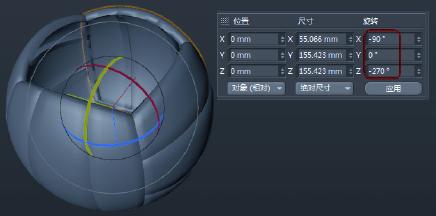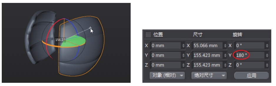 ,视图中出现旋转操控器。按住Ctrl键再拖动绿色的环进行旋转复制,在“坐标管理器”属性面板中设置精确的旋转角度为180°,操作结果如图3-177所示。