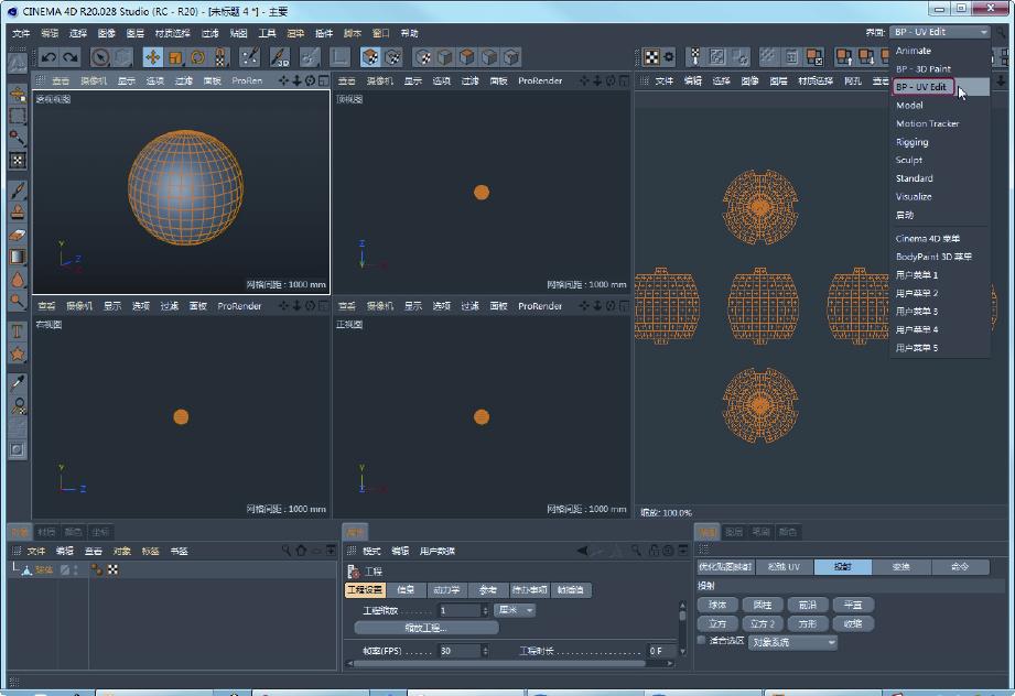 将球体模型转化为可编辑对象。在软件窗口顶部的右侧“界面”下拉列表中选择BP-UV Edit界面类型,进入BP-UV Edit工作界面,如图3-187所示。