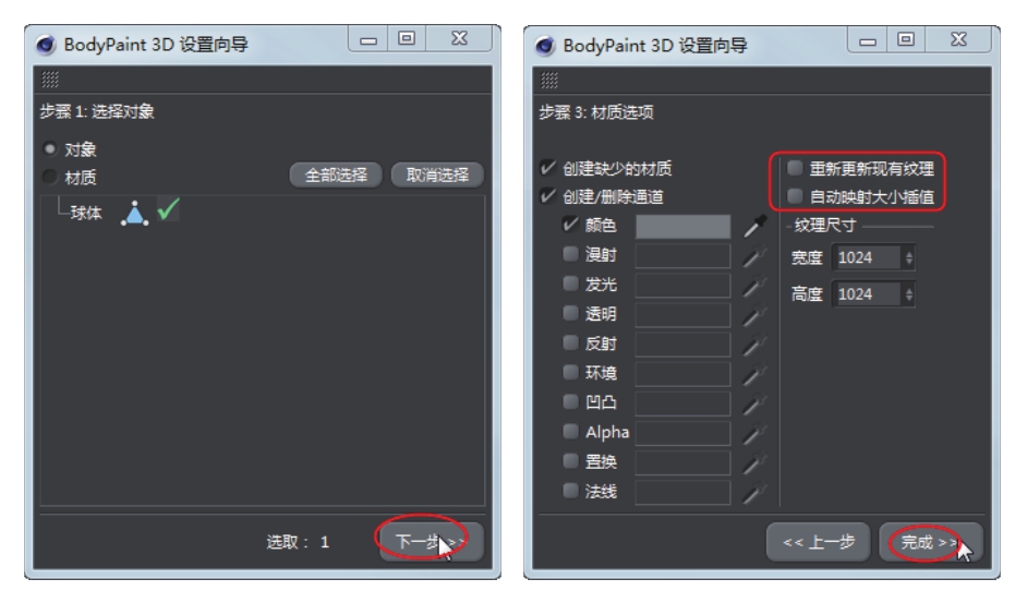 ,弹出“BodyPaint 3D设置向导”对话框,单击“下一步”按钮,进入“步骤3:材质选项”页面。取消选中“重新更新现有纹理”和“自动映射大小插值”复选框,单击“完成”按钮完成绘画向导设置,如图3-188所示。