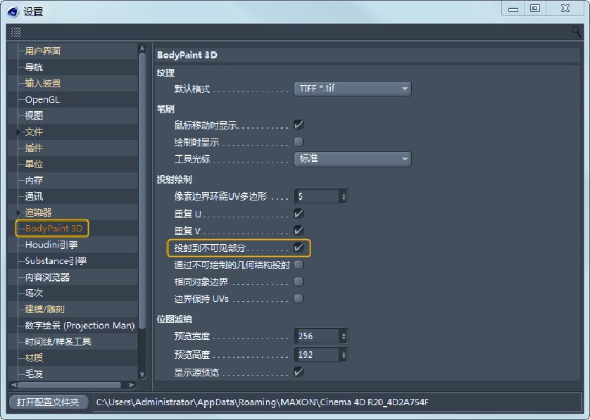 07 执行“编辑”|“设置”命令,打开“设置”对话框。在BodyPaint 3D设置页面中选中“投射到不可见部分”复选框,如图3-191所示。这样在绘制直线时前面与背面将同时存在直线。