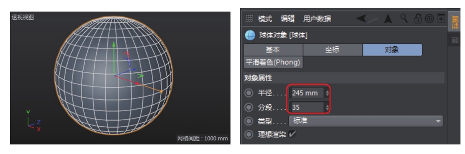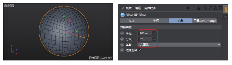 ,创建一个半径为100mm的球体,在其属性面板中设置“分段”值(37段)和类型(六面体),如图3-164所示。