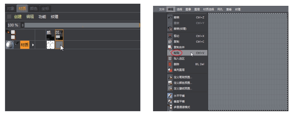 17 在“材质”管理器中选择新建的纹理,并到视图右侧的面板中选择“编辑”|“粘贴”命令,将剪贴板中复制的纹理粘贴出来,如图3-202所示。这个过程的意义就在于为原本平面的纹理添加凹凸感,形成篮球的凹陷感。