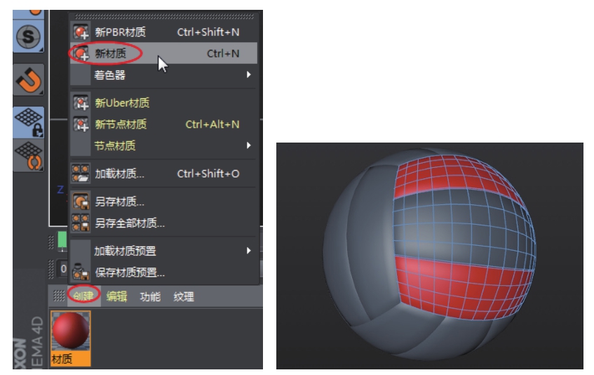 19 在“材质”管理器中执行“创建”|“新材质”命令,创建一个新材质。双击新材质,将其颜色改为红色。将材质拖至视图中所选的面上,即可完成材质的添加(填色),如图3-182所示。