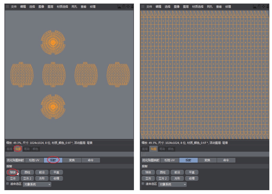,在“贴图”属性面板中单击“球体”按钮,转换成球体贴图方式,便于查看绘画情况,如图3-189所示。