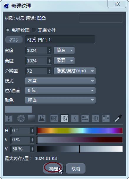 15 在视图下方的“材质”管理器中,右击材质图标,在弹出的快捷菜单中选择“纹理通道”|“凹凸”命令,打开“新建纹理”对话框,如图3-199所示。保持默认的选项设置,单击“确定”按钮完成新纹理的创建,如图3-200所示。