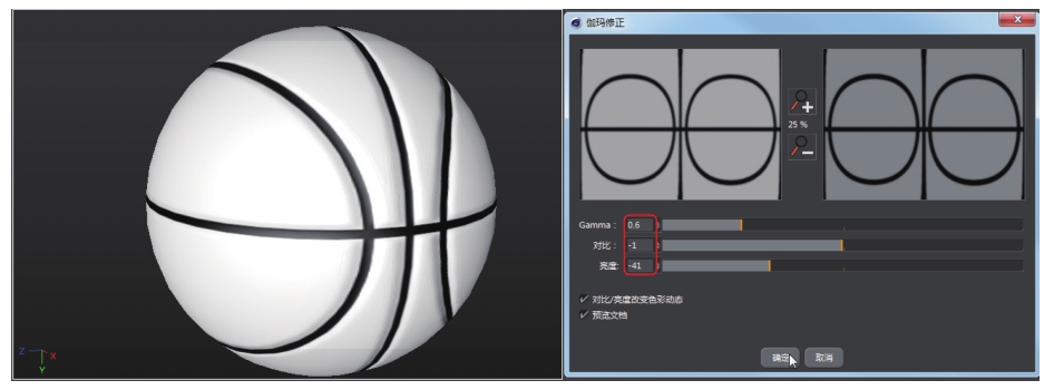 20 再执行“过滤”|“矫色”|“Gamma校正”命令,调整对比度和亮度,单击“确定”按钮后可见篮球的凹陷效果更明显了,如图3-205所示。