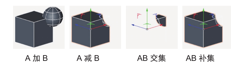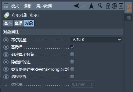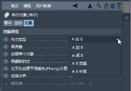 03 此时系统自动执行了布尔运算操作,可以在“布尔对象【布尔】”属性面板的“对象”选项卡中选择布尔类型,以获得不同的布尔运算效果,如图4-15所示。