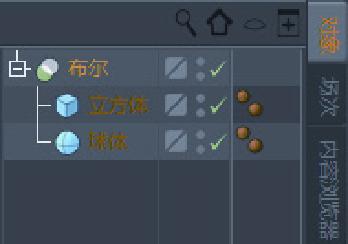 ,并在“对象”管理器中将立方体和球体拖入“布尔”对象中,成为其子对象,如图4-14所示。