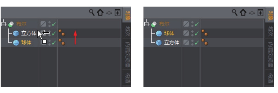 A与B的位置可以交换,可以在“对象”管理器中拖动子对象调换位置,更换位置后即可得到不同的布尔运算结果,如图4-18所示。