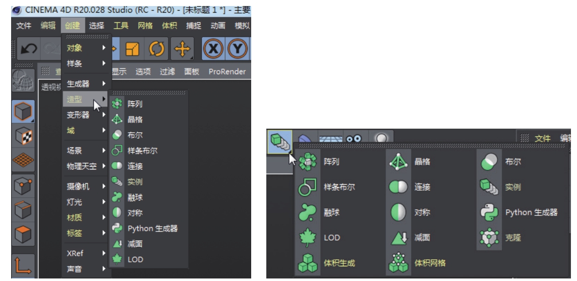 C4D中的造型工具的操作对象是点、线、面及实体。可以执行“创建”|“造型”命令,调出对象造型工具,也可以在上工具栏中调用造型工具,如图4-1所示。本节将介绍一些常用的造型工具。