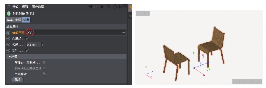 ,在“对象”管理器中将椅子对象拖至对称对象中,然后到“对称对象【对称】”属性面板的“对象”选项卡中设置“镜像平面”为XY,视图中将创建椅子的镜像对象,如图4-36所示。