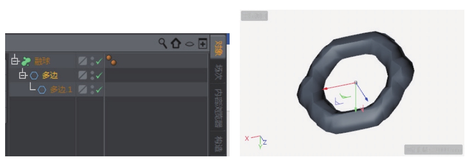 ,创建融球对象。在“对象”管理器中将正多边形对象拖至融球对象中,成为其子对象,可见视图中创建了融球效果,如图4-31所示。
