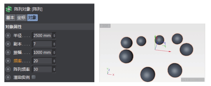 ● 频率:控制阵列对象的波动频率,值越大波速运动越快。