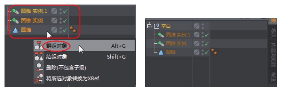 04 在“对象”管理器中选中所有的对象,右击并选择快捷菜单中的“群组对象”命令,将多个对象成组,结果如图4-26所示。
