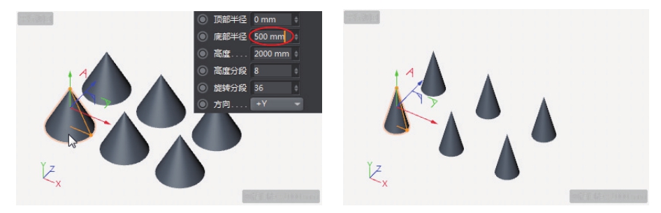 06 在视图中选取原始对象,并修改其“底部半径”参数,可见其他副本将随之更改,如图4-28所示。而这种创建实例的方法就等同于对象的矩形阵列。同理,还可以拖动轴并按下Ctrl键来创建更多的副本。