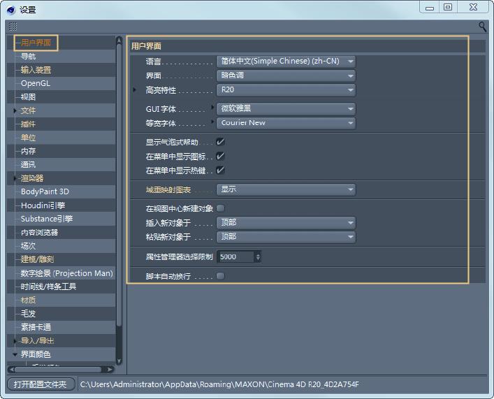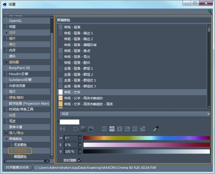 04 如果不习惯CINEMA 4D R20默认的暗黑色背景及菜单,可以通过“界面颜色”选项页进行设置,如图1-13所示。