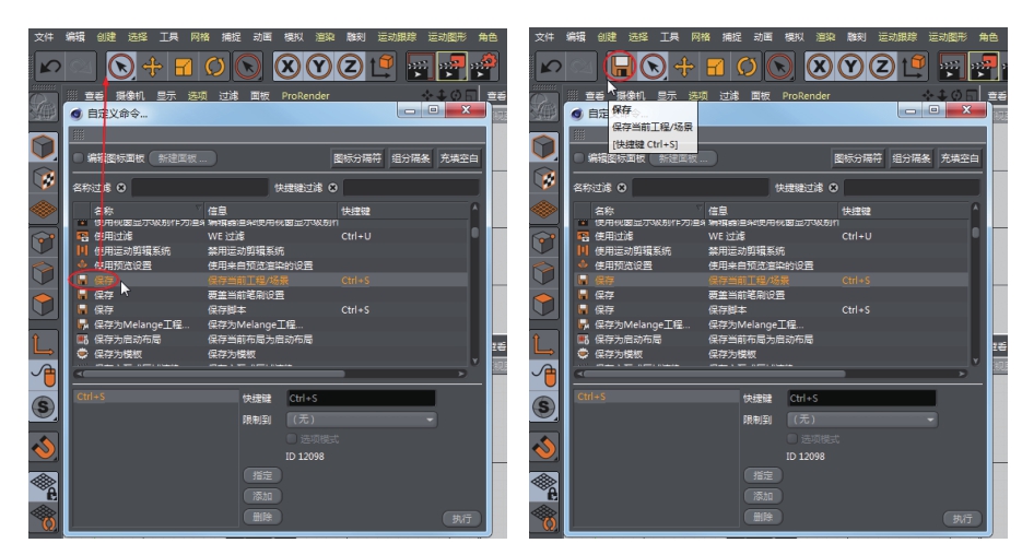 03 执行“窗口”|“自定义布局”|“自定义命令”命令,或者在视图控制菜单中选择“自定义命令”命令,又或者在管理器面板中的管理器控制菜单中选择“自定义命令”命令,都可以弹出“自定义命令”窗口,如图1-46所示。