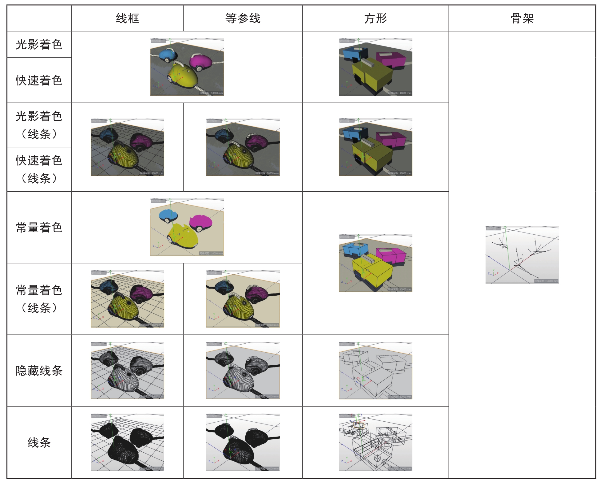 “显示”菜单上可以找到与显示设置相关的选项,例如着色模式。表1-1列出了系统提供的着色与线框、等参线、方形及骨架等搭配显示的类型。