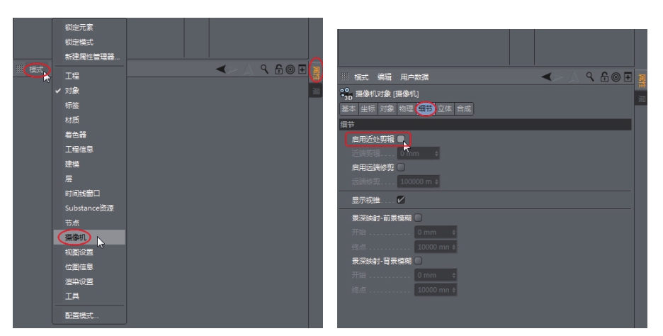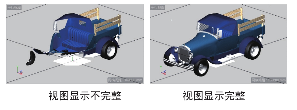 如果切换视图后发现模型视图显示不完整,说明视图被自动修剪了,需要在“属性”管理器面板中选择“模式”|“摄像机”命令,然后在摄像机的“细节”选项卡中取消选中“启用近处剪辑”复选框即可,如图1-22所示。模型视图显示不完整及显示完整的对比图如图1-23所示。