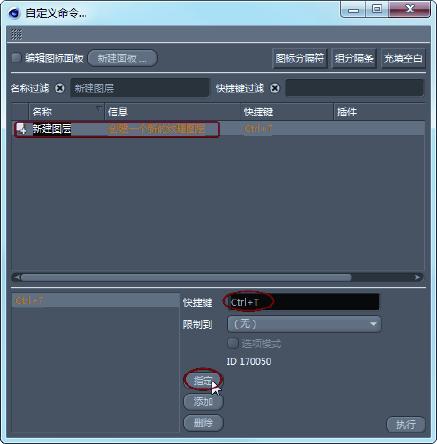 04 在“自定义命令”窗口的命令列表中选择一个命令(如“新建图层”),然后在“快捷键”文本框中输入一个快捷键命令(Ctrl+T),单击“指定”按钮完成该命令的快捷键定义,如图1-47所示。
