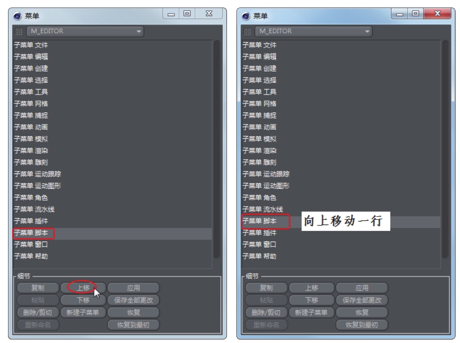 02 在“菜单”窗口中选择不常用的子菜单选项,在下方单击“复制”“粘贴”“上移”“下移”“删除/剪切”“重新命名”等按钮,进行相应操作。例如,选中“子菜单脚本”选项,单击“上移”按钮,可将其在相应菜单中上移一行位置,如图1-44所示。单击“应用”按钮,将改动应用到菜单中,如图1-45所示(因为是横向菜单,所以为前移一列)。