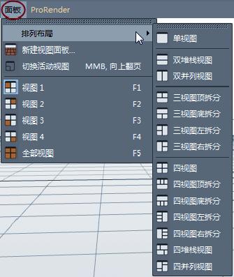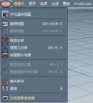在视图上方有7个视图菜单:查看、摄像机、显示、选项、过滤、面板和ProRender。
