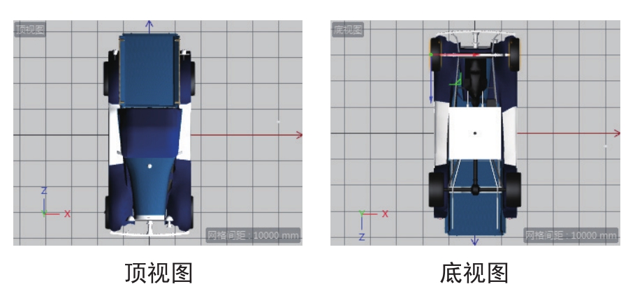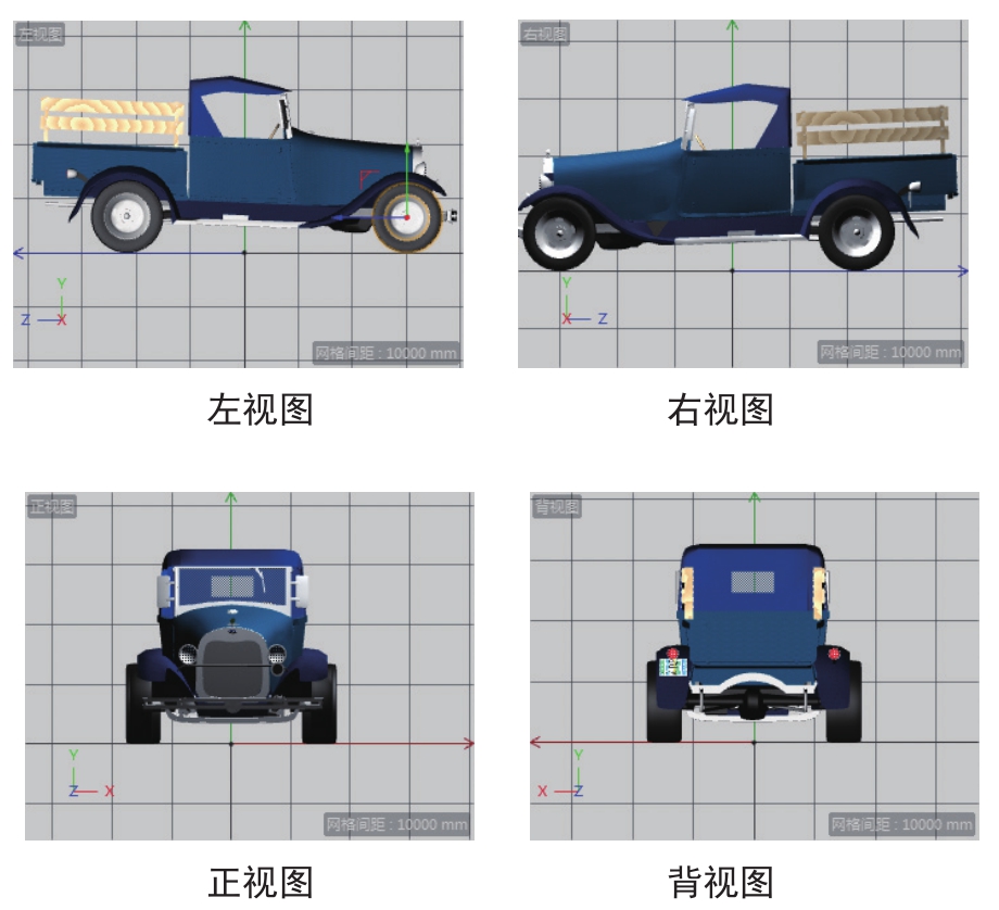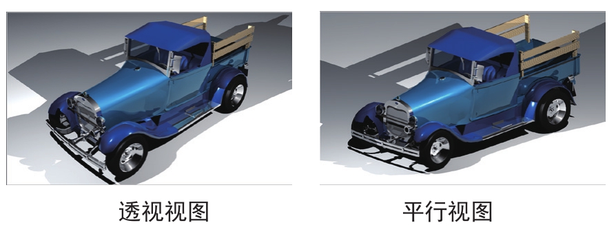 ● 透视视图、平行视图:可以以透视视图或平行视图来显示模型。透视视图是自然环境下的场景模式,主要用于渲染;平行视图为三维建模时的建模视图,所有线都是平行的。透视视图与平行视图的效果对比如图1-19所示。