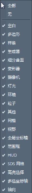 选择此菜单中的命令可以从视图中隐藏或显示某一类型的对象。默认情况下,所有类型都已启用并在视图中显示。要隐藏视图中的所有样条线,可以选择“过滤”|“样条”命令,此时样条被隐藏。要再次显示样条线,就再次选择“样条”命令。关于单个对象的隐藏或显示,将在后面视图操作中介绍。“过滤”菜单如图1-25所示。