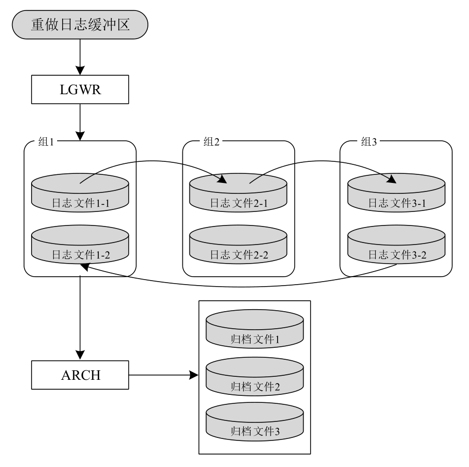 归档(ARCH)进程是一个可选择的进程,只有当Oracle数据库处于归档模式时,该进程才可能起到作用。若Oracle数据库处于归档模式,当各个日志文件组都被写满,在即将被覆盖之前,先由ARCH把即将被覆盖的日志文件中的日志信息读出,然后再把这些“读出的日志信息”写入归档日志文件中,如图2.18所示。