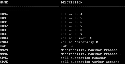SQL> set pagesize 50; SQL> select name,description from v$bgprocess;
